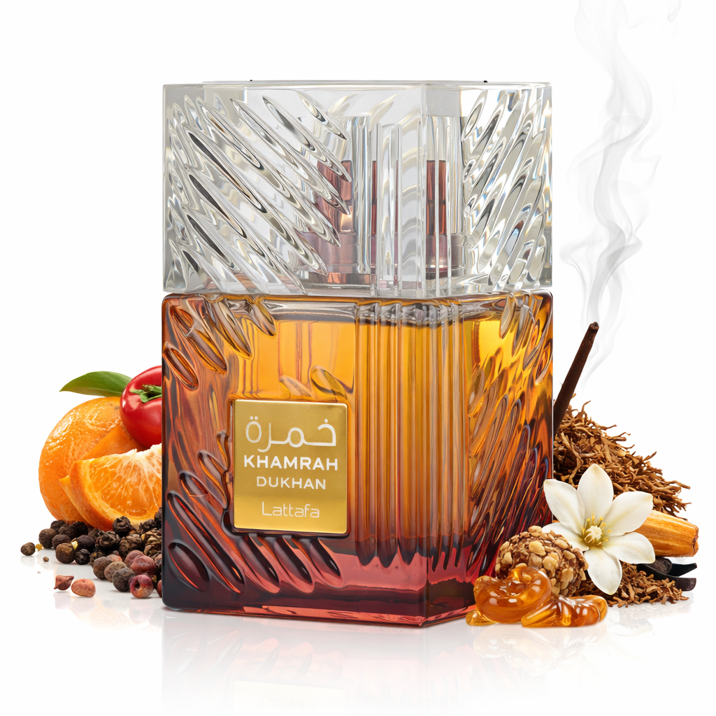 An addictive composition of raw energy and enigmatic boldness, Khamrah Dukhan is a hypnotic tribute to a rich Middle Eastern ritual, reimagined for today ’s times . By evoking the ritual of burning perfume, the fragrance captures the sacred, rising trail of smoke, ethereal yet commanding, unforgettable in its presence. While the bold rush of pimento and smoked spices sparks raw energy and the deep allure of tobacco and amber adds strength and sophistication. Crafted for evening intrigue and bold impressions. Created for the modern man rooted in tradition yet defined by his own power. Lattafa Khamrah Dukhan ignites the senses from the first notes with a fiery fusion of Mandarin, Pimento and Smoked Spices that’s instantly striking, instantly memorable. The heart deepens with a rich blend of Cistus, Orange Flower, Incense and earthy Patchouli , evoking the sacredness of ancient rituals. Finally, a base of Tobacco, Amber, Tonka Bean, Benzoin and a touch of Praline grounds the scent in smoky warmth and magnetic sophistication. ‘ Dukhan ’, meaning “smoke”, sets the tone for a fragrance that is both ancestral and avant-garde and captures the essence of rising smoke that’s fluid, commanding, unforgettable. Though unisex in spirit, this edition leans more into masculine strength embod y i ng power, confidence and an undeniable presence. Best For: Evening intrigue, bold impressions, the modern man rooted in tradition yet defined by his own power